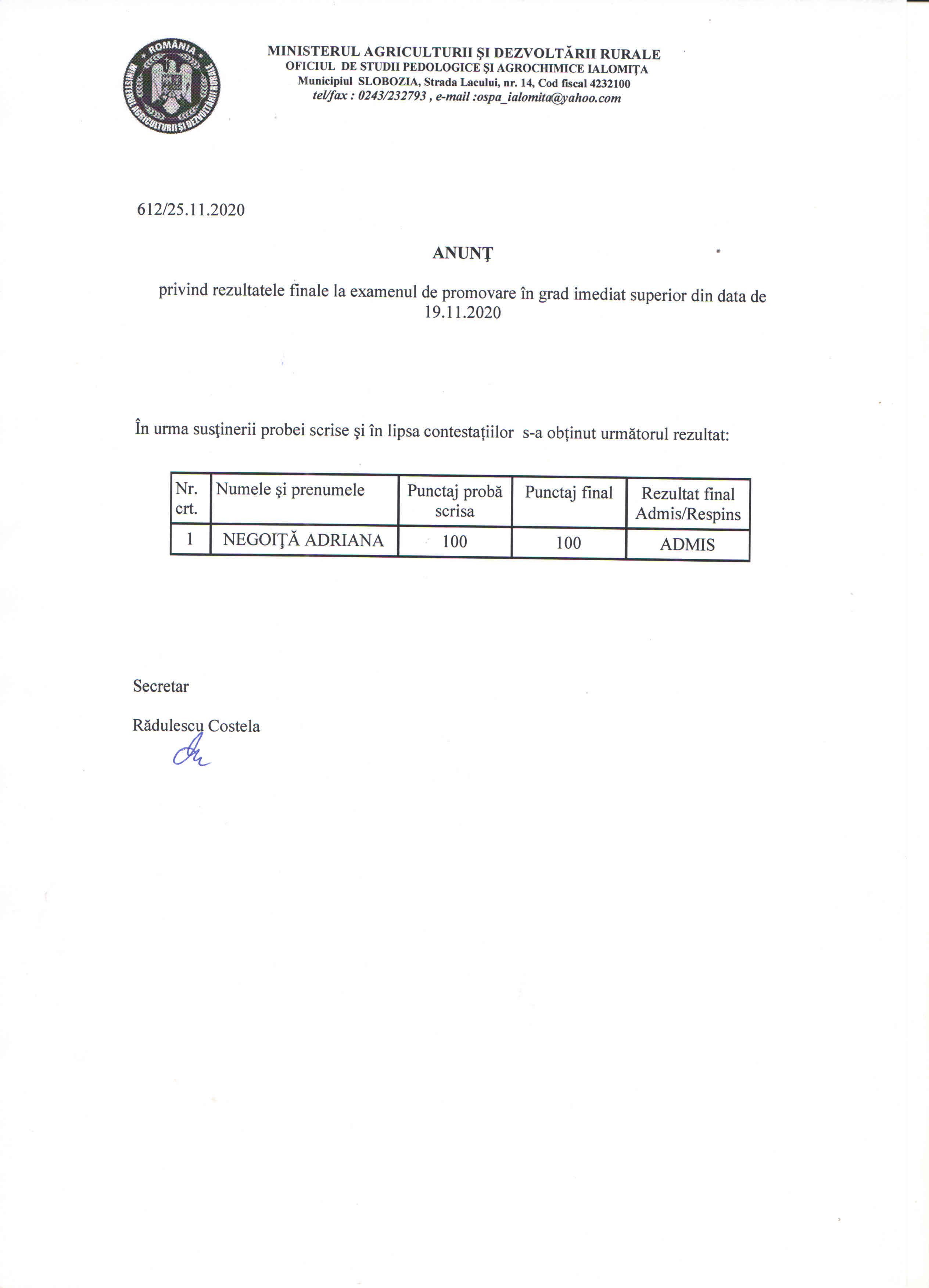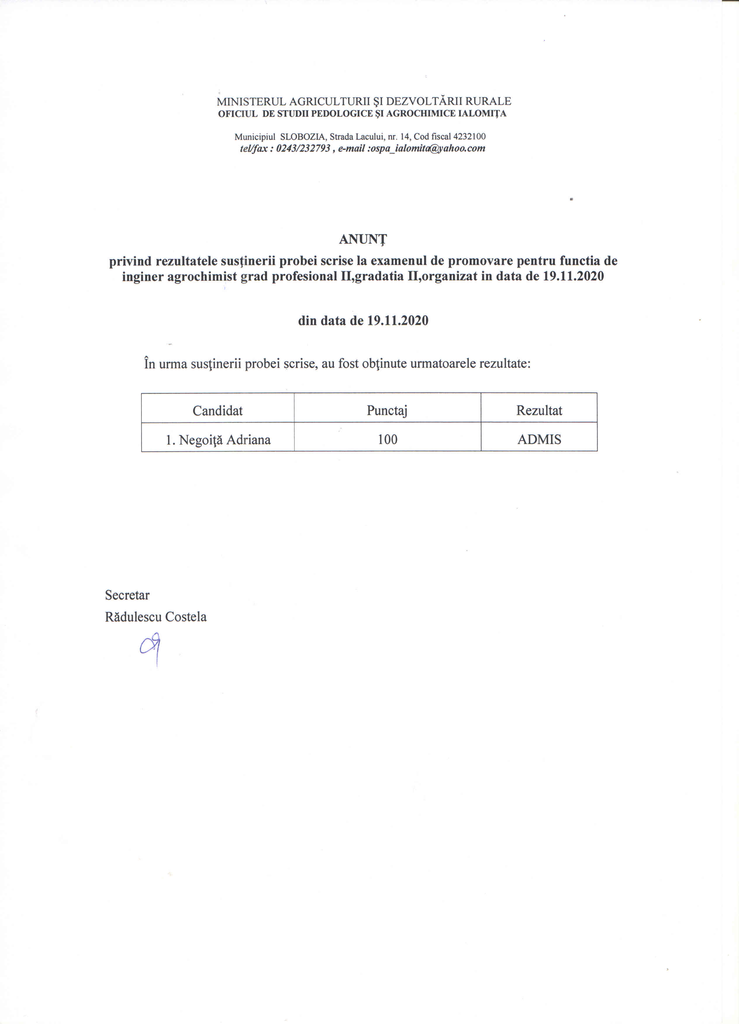 ANUNT REZULTAT FINAL CONCURS INGINER AGROCHIMIST 19.11.2020