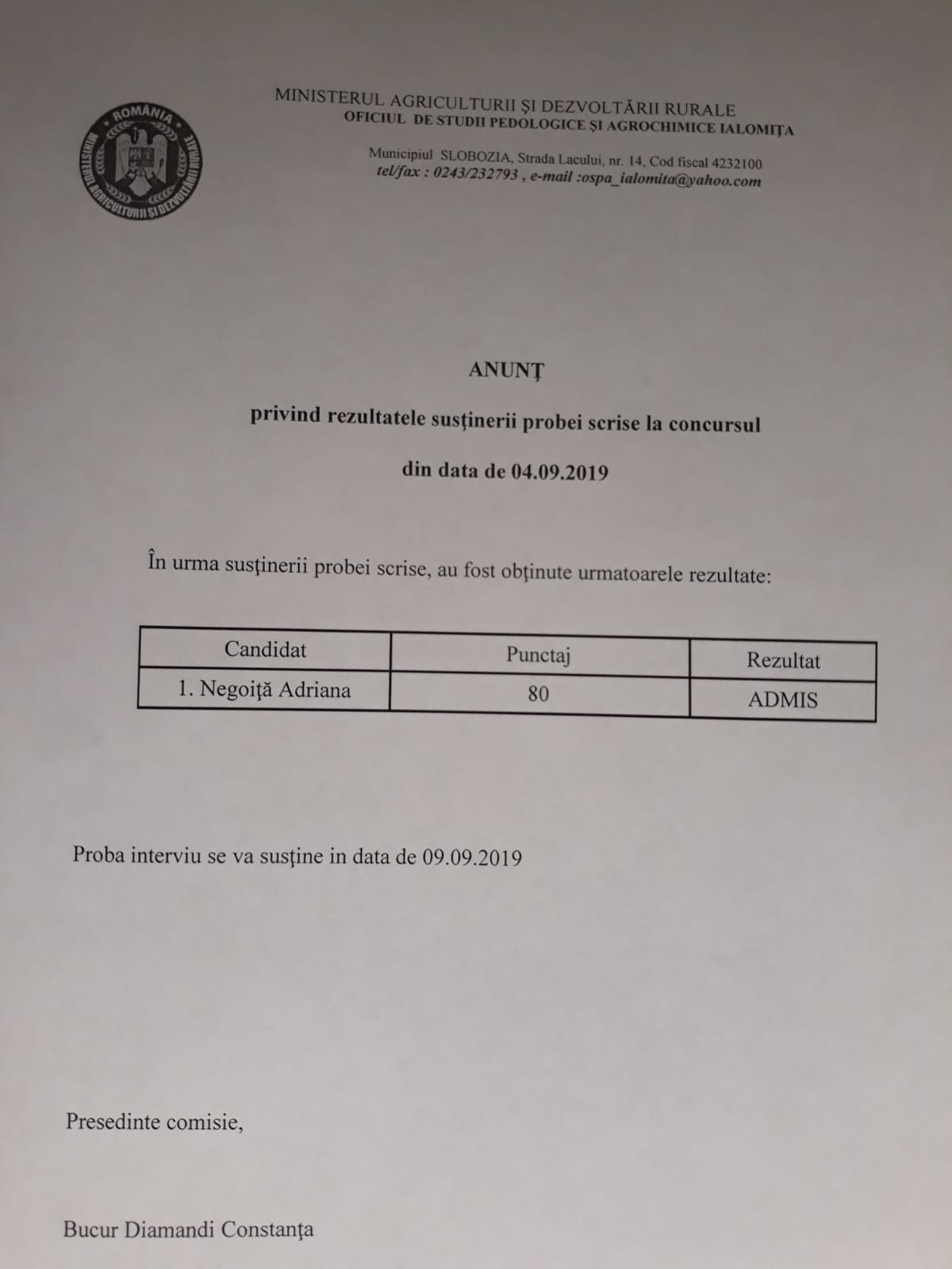 ANUNT REZULTAT PROBA INTERVIU CONCURS INGINER AGRONOM 04.09.2019